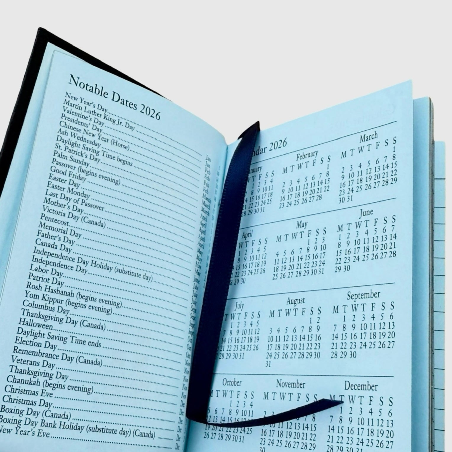The calendar is smyth sewn and covered with textured leather. 2026 is stamped in gold on the front. Removable address and notes sections are available and slide into a pocket inside the back cover. Personalization is available.