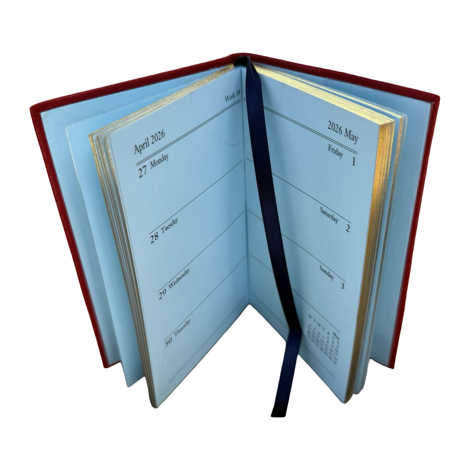 Made in England with cross-grain leather. Features blue Italian paper and stunning gilt gold edges. A full week is shown across two pages when open. Extra pages in front and back including address, memo, and useful charts and reference guides.