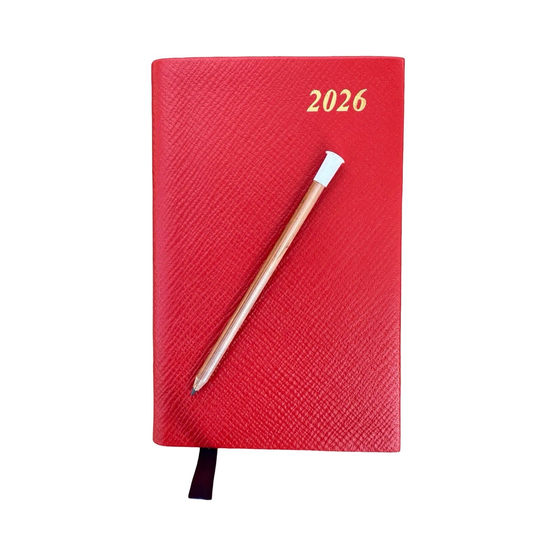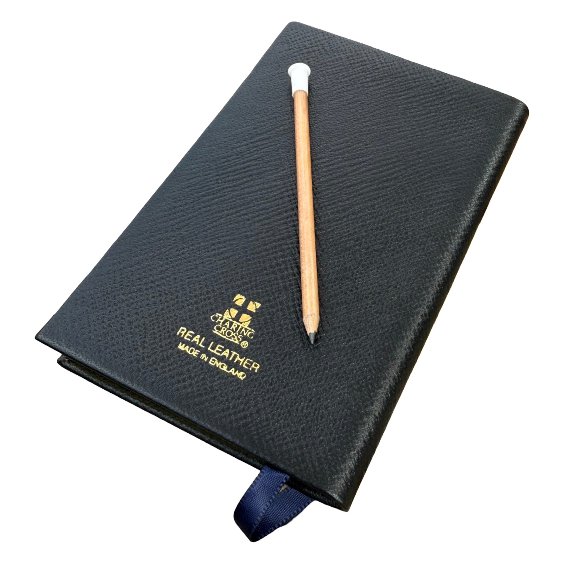 Our textured crossgrain leather pocket calendar with a wood pencil in the spine hand made in England by Charing Cross.