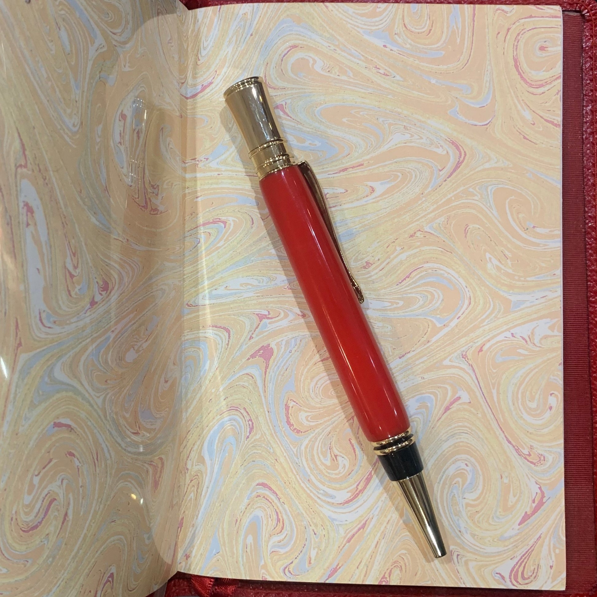 The writing instrument shown is one of our wonderful ballpoint pens. These are produced for us in Pennsylvania and are available in colours to match with our crossgrain leather. Please allow us to know of your interest. They are wonderful!